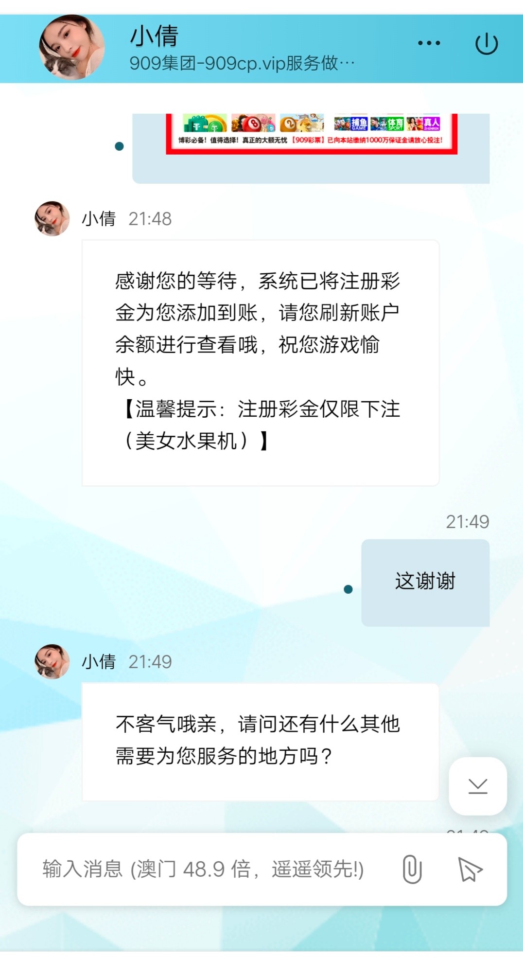 进去之后找在线客服申请,让你提供账号和银行卡信息,以及看到注册奖励的广告截图(附下图,可保存提供),不给就换个客服,我换了个送了,彩金只能玩美女水果机,出款自测。